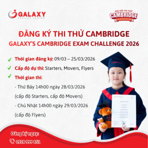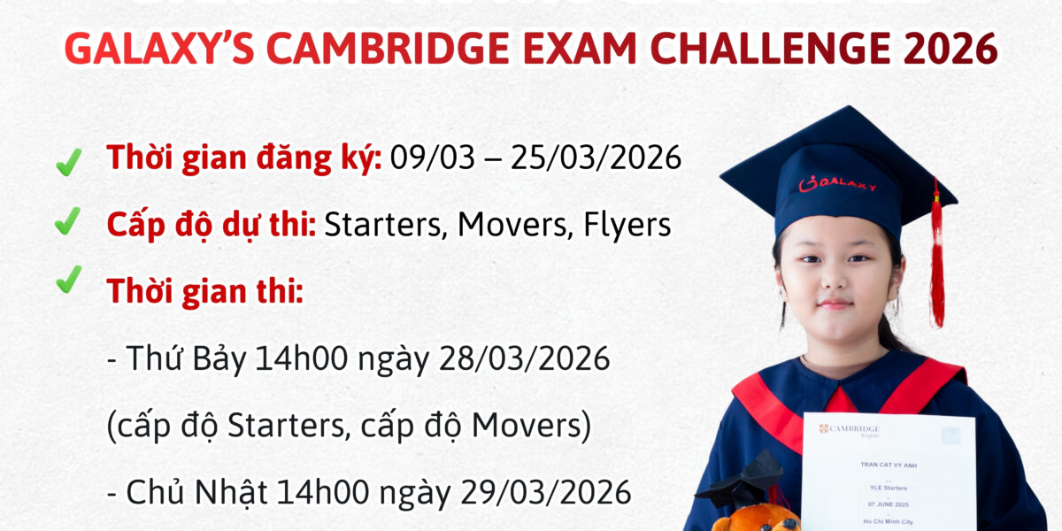 Nhằm giúp phụ huynh và học viên có cái nhìn rõ ràng hơn về khả năng của mình trước kỳ thi chính thức, Trung tâm Anh ngữ Galaxy tổ chức chương trình Thi thử Cambridge – Galaxy’s Cambridge Exam Challenge 2026.
