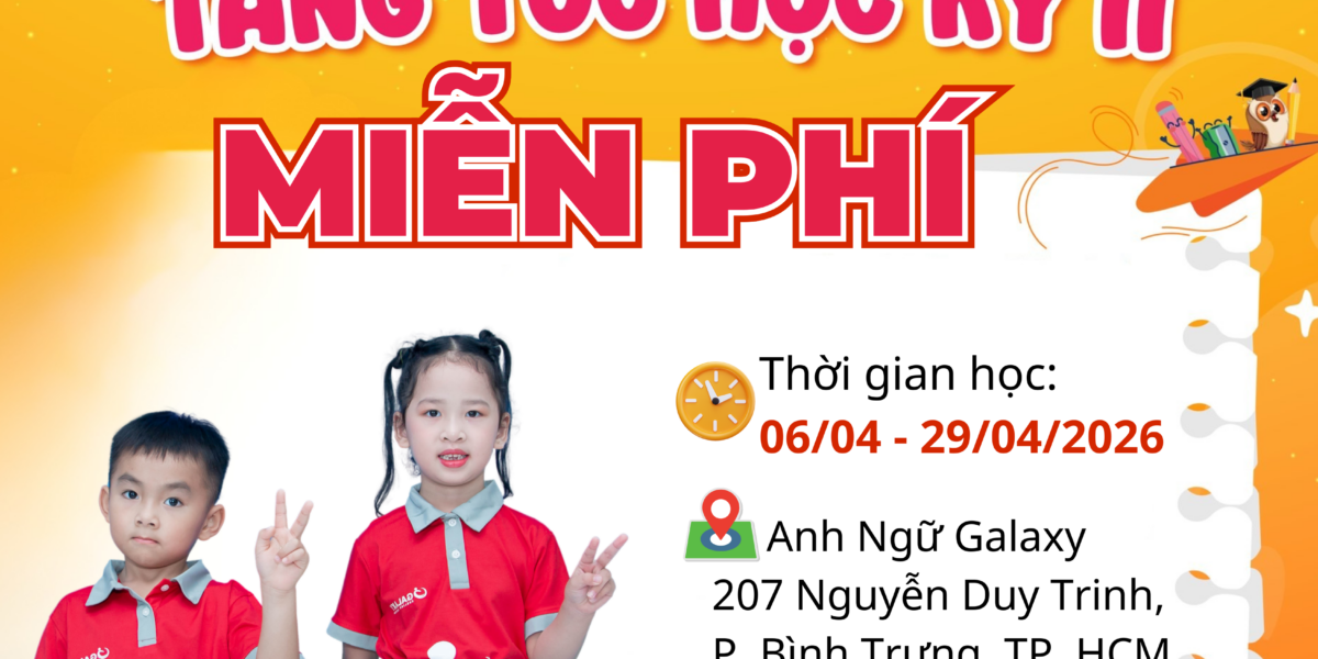 Tăng tốc ôn thi học kỳ II miễn phí là chương trình hỗ trợ học tập thiết thực được Anh Ngữ Galaxy triển khai dành cho học viên trong giai đoạn nước rút của năm học. Đây là thời điểm quan trọng để các con củng cố kiến thức, rèn luyện kỹ năng làm bài và tự tin hơn trước các bài kiểm tra trên lớp.